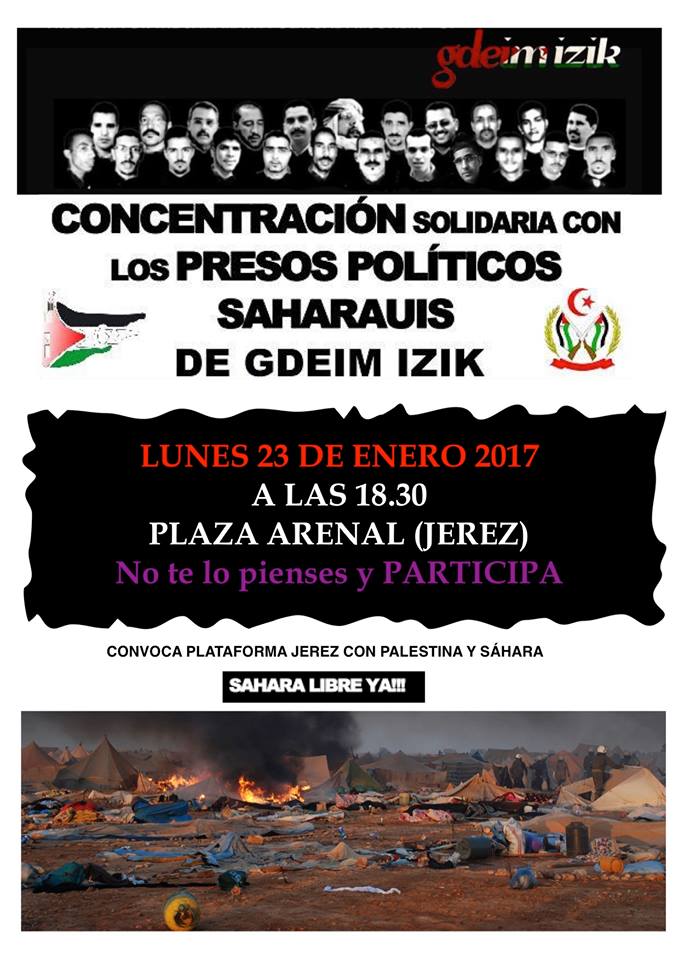 — Concentración 23 Enero a las 18.30 en la Plaza del Arenal en apoyo a los presos politicos saharuis de Gdeim Izik. El próximo 23 de de enero se reanudará el juicio de Gdeim Izik, un juicio ilegal de hombres inocentes cuyo único delito es ser saharauis y defender el derecho a sus tierras de manera no violenta y de conformidad con las resoluciones internacionales.
